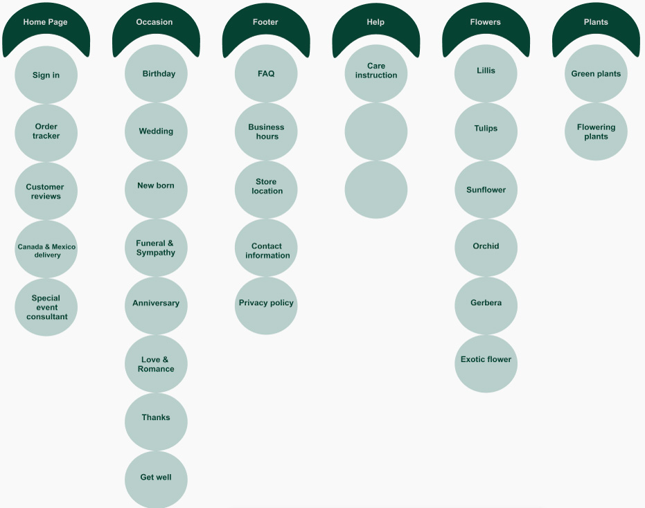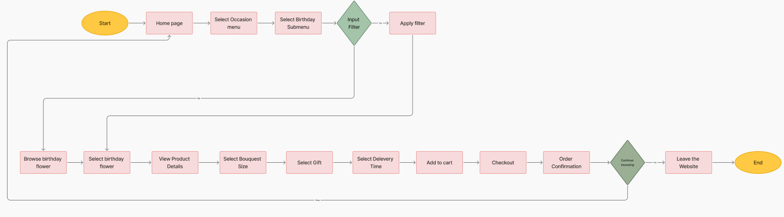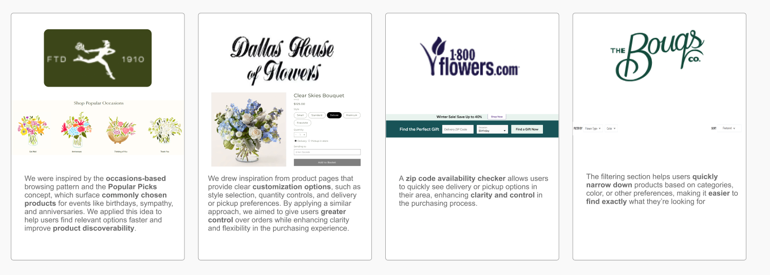 A competitive analysis was conducted using four florist websites to evaluate common design patterns, usability practices,customization options and filters within the industry. This review helped identify strengths, weaknesses, and gaps in the current market. The findings were used to guide design decisions and improve clarity, trust, and overall user experience in the final solution.