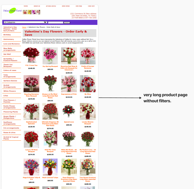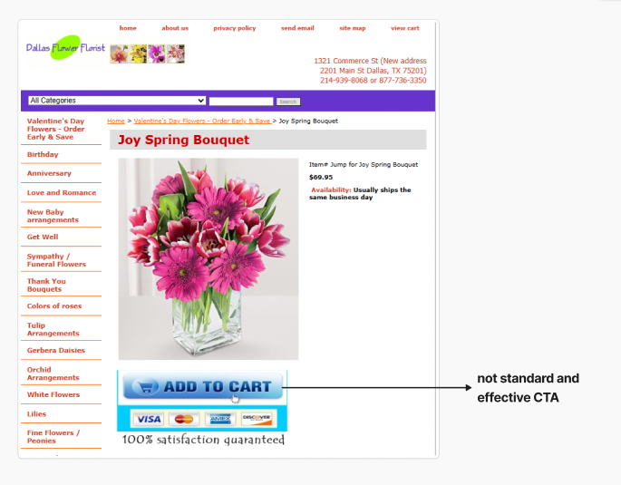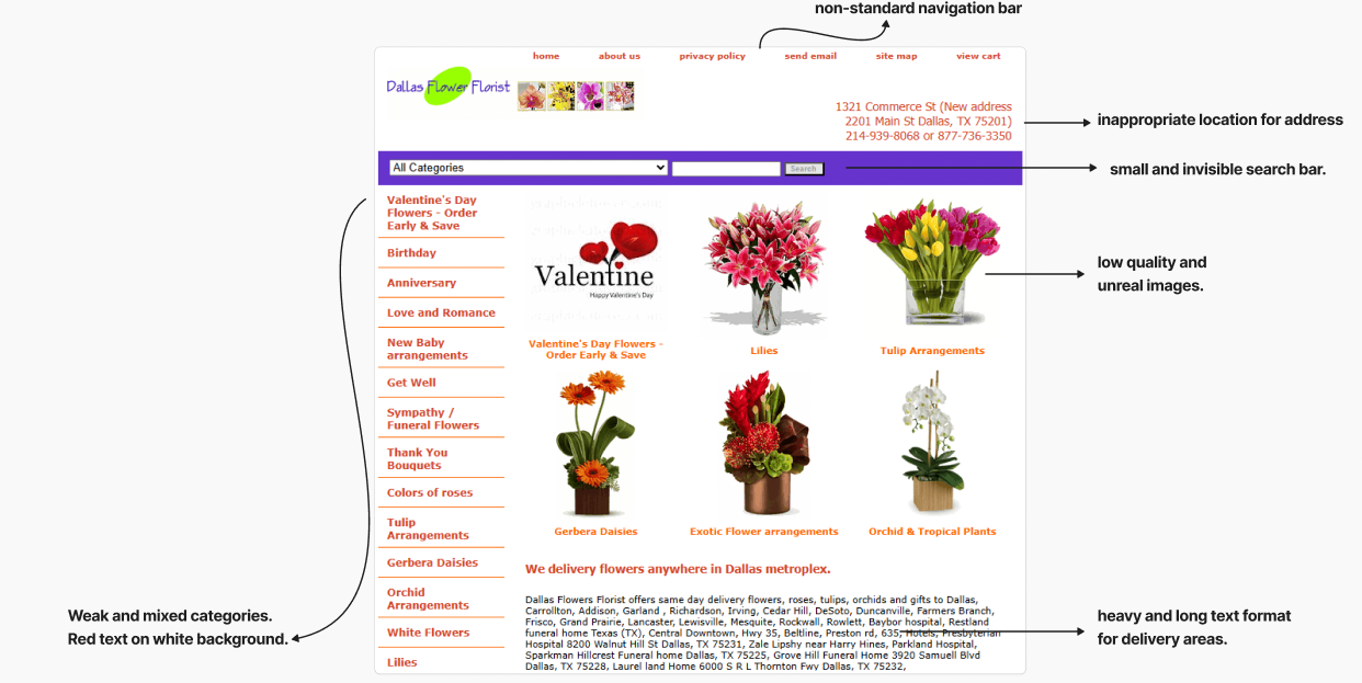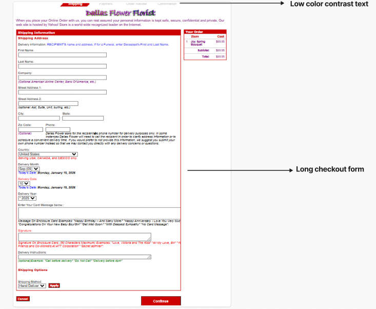 A heuristic evaluation was conducted to review the usability of the Dallas Flower Florist website using established UX principles. The assessment focused on core user tasks such as browsing products, understanding product information, and completing a purchase. This process revealed multiple usability issues related to navigation clarity, visual contrast, and checkout usability, which created friction and reduced user confidence during the shopping experience.
