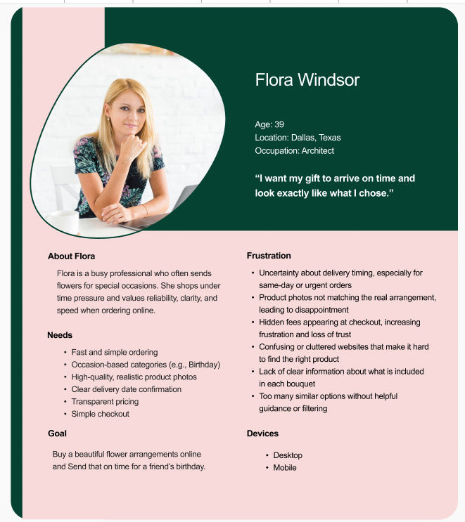 The target users of the Dallas Flower Florist website are adults who need to purchase flowers quickly for special occasions such as birthdays, anniversaries, or sympathy messages. These users are often time-constrained, may not have deep knowledge of floral arrangements, and rely on clear categories, visual guidance, and a smooth checkout experience to complete their purchase confidently.